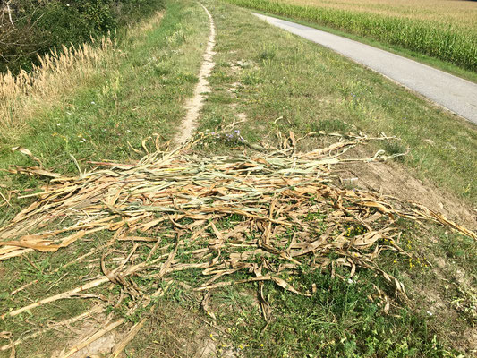 Mir viel immer wieder auf, dass zwischen der Donau und den angrenzenden Maisfelder, ganze Maisstauden quer über dem Radweg lagen. Alle fünfzig Meter lagen diese Maisstengel über dem Radweg. Ich