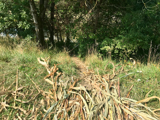 auch da lag das Mais. Und da begriff ich, das waren nicht „Nachtbuben“ sondern Biber die ihre nächtliche Arbeit nicht vollendet hatten. Leider vergass ich diese Spuren zu fotografieren. Erst