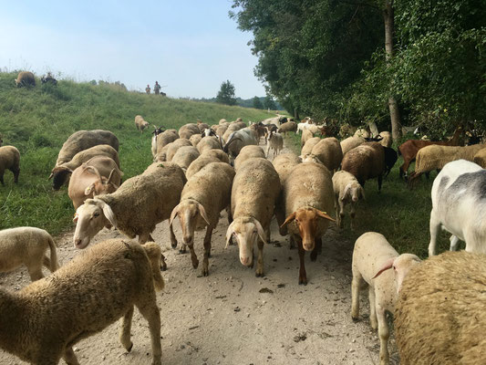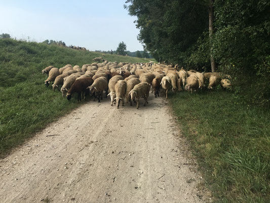 Etwas später fuhr ich auf dem Schotterweg, links der Donaudamm, rechts Wald. Da taucht vor mir eine Herde mit Schafen und Ziegen auf. Die Schafe fressen Gras und die Ziegen strecken sich in die