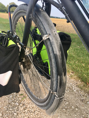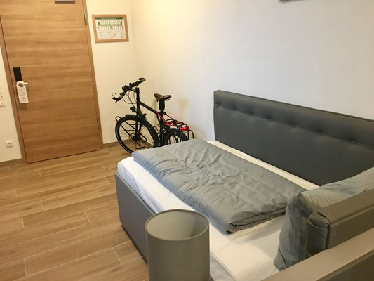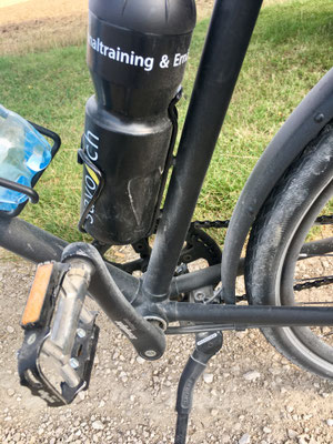 Die gestrige und heutige Fahrt über Feldwege hat auch Spuren am Fahrrad, den Packtaschen und mir hinterlassen. Wir alle waren so richtig staubig. Neben meinem heutigen Hotel befindet sich eine